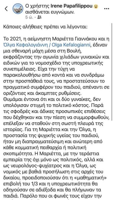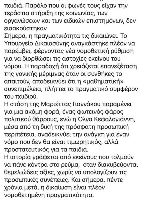 Η ίδια συγκεκριμένα κάνει αναδημοσίευση μίας ανάρτησης που έχει «ανεβάσει» άλλο άτομο και περιγράφει την περίοδο όπου ψηφίστηκε το νομοσχέδιο για την συνεπιμέλεια, όταν η Όλγα Κεφαλογιάννη μαζί με την Μαριέττα Γιαννάκου, έδωσαν τον δικό τους αγώνα προκειμένου να μην περάσει μία οριζόντια ρύθμιση που θα έβλαπτε τα παιδιά.