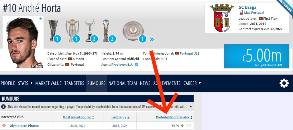 Στο 69% «σκαρφάλωσε» η πιθανότητα μεταγραφής του Αντρέ Όρτα στον Ολυμπιακό, σύμφωνα με την επίσημη ιστοσελίδα του Transfermarkt.