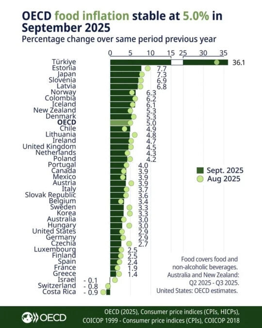 Σύμφωνα με τα τελευταία στοιχεία για τον Σεπτέμβριο 2025, ο πληθωρισμός στα τρόφιμα στην Ελλάδα διαμορφώθηκε στο 1,4%, έναντι 3,5% στον μέσο όρο της ΕΕ και 5% στις χώρες του ΟΟΣΑ. Αυτό τοποθετεί την Ελλάδα στη χαμηλότερη θέση στην ΕΕ και στην τέταρτη χαμηλότερη θέση ανάμεσα στις 38 χώρες-μέλη του ΟΟΣΑ.
