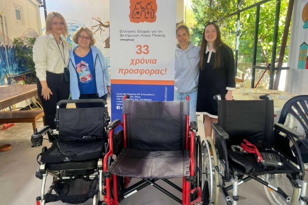 παιδιών «Εθελοντούμε», παρέδωσε 1 ηλεκτρικό αμαξίδιο, 2 απλά αμαξίδια και μία περπατούρα στην Ελληνική Εταιρεία Σκλήρυνσης Κατά Πλάκας, με έδρα την
