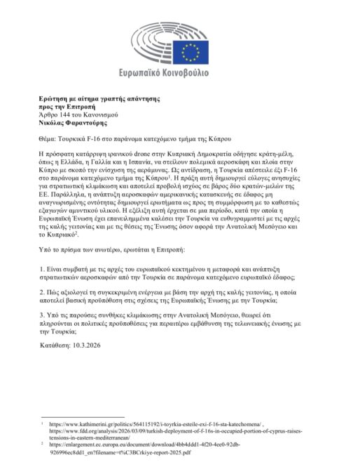 Κατεπείγουσα ερώτηση προς την Κομισιόν για την εγκατάσταση Τουρκικών F-16 στα κατεχόμενα της Κύπρου, κατέθεσε ο ευρωβουλευτής και μέλος των επιτροπών Ασφάλειας & Άμυνας και Ευρω-αμερικανικών σχέσεων του Ευρωπαϊκού Κοινοβουλίου, Νικόλας Φαραντούρης.