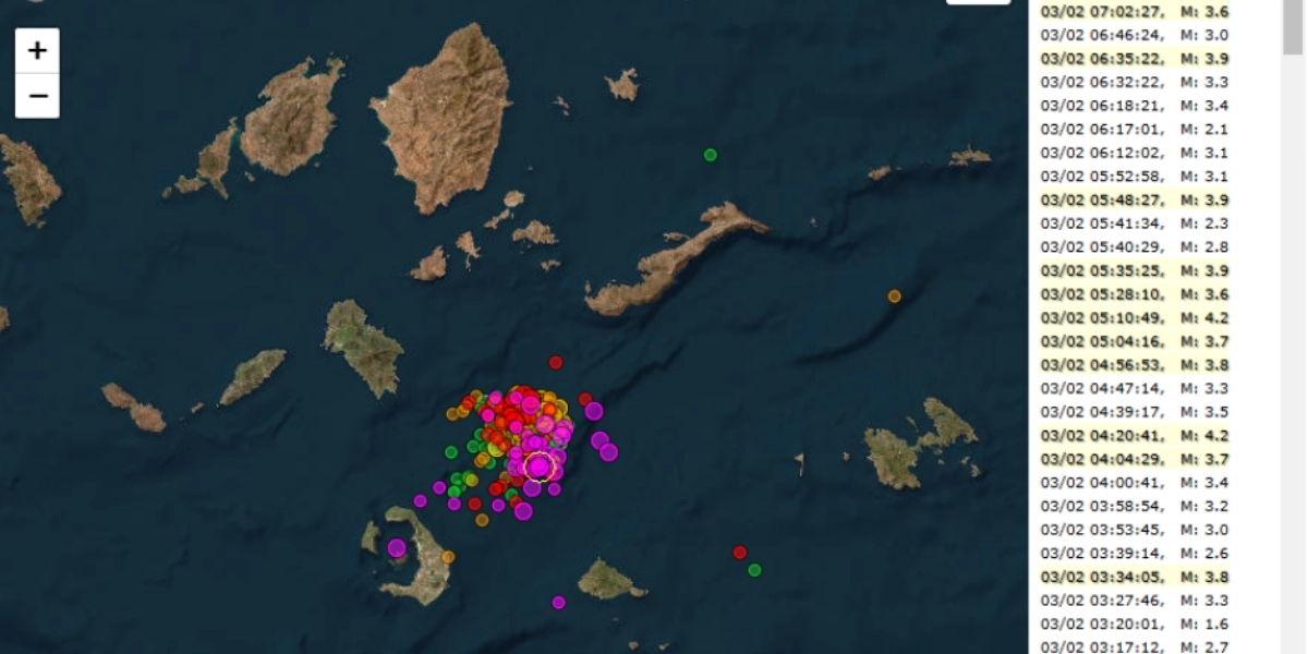 Μέσα στη νύχτα κατεγράφησαν δεκάδες σεισμικές δονήσεις. Μεγαλύτερου μεγέθους ήταν ο σεισμός 4,4 βαθμών της κλίμακας Ρίχτερ που σημειώθηκε ανοιχτά της Σαντορίνης λίγο πριν τις 2 τα ξημερώματα της Δευτέρας και σύμφωνα με το Γεωδυναμικό Ινστιτούτο το επίκεντρο της δόνησης εντοπίστηκε 22 χλμ νότια της Αμοργού και το εστιακό βάθος ήταν στα 10 χλμ. Ενώ στις 04:35, στην υποθαλάσσια περιοχή μεταξύ Σαντορίνης και Αμοργού σημειώθηκε ακόμη μία μεγέθους 4,3 Ρίχτερ, 16 χλμ βόρεια βορειοδυτικά της Ανάφης με εστιακό βάθος στα 5 χλμ, σύμφωνα με την Αυτόματη Λύση του Γεωδυναμικού Ινστιτούτου.