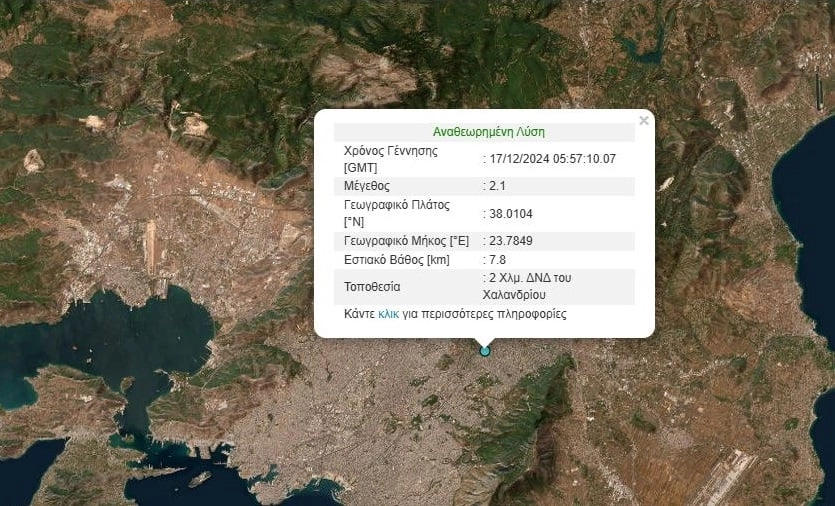 Σεισμός 2,1 βαθμών της κλίμακας Ρίχτερ σημειώθηκε πριν από λίγο στην Αθήνα. Η σεισμική δόνηση έγινε αισθητή σε πολλές περιοχές της Αττικής.