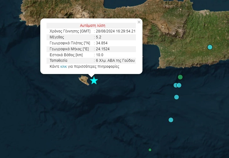 Σύμφωνα με την αυτόματη λύση του Γεωδυναμικού Ινστιτούτου του Αστεροσκοπείου Αθηνών ο σεισμός σημειώθηκε στις 19:29 στη θαλάσσια περιχή νότια της Κρήτης και είχε ένταση 5,2 βαθμούς Ρίχτερ.