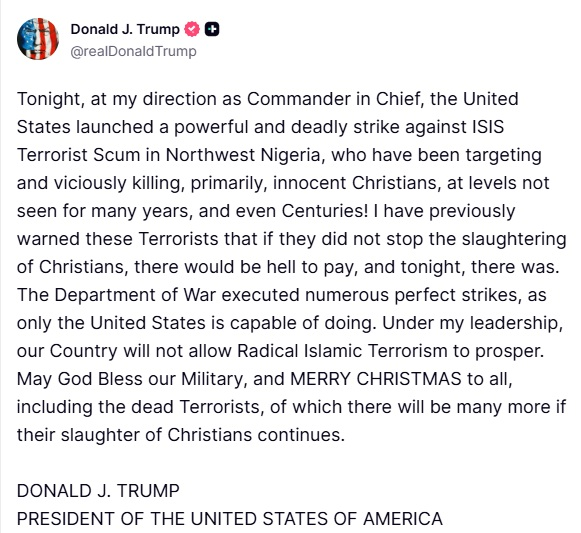 Ο κ. Τραμπ, αναφερόμενος στους βομβαρδισμούς μέσω Truth Social, επανέλαβε τον ισχυρισμό του, ο οποίος έχει αντικρουστεί από τις νιγηριανές αρχές, ότι οι τζιχαντιστές «στοχοποιούν και σκοτώνουν (…) κυρίως αθώους χριστιανούς, σε επίπεδα που δεν είχαν παρατηρηθεί επί χρόνια, ακόμη και αιώνες!».