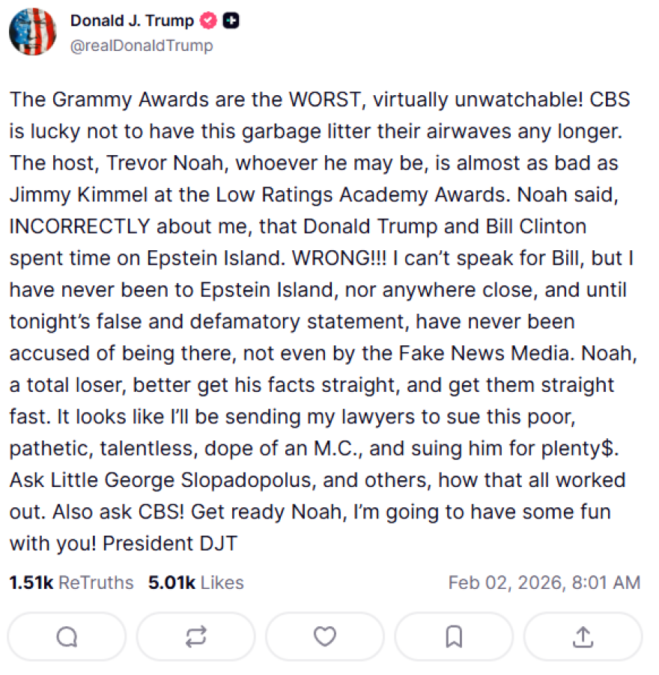 «Τα Βραβεία Grammy είναι τα ΧΕΙΡΟΤΕΡΑ, σχεδόν αδύνατο να τα παρακολουθήσει κανείς! Το CBS είναι τυχερό που αυτά τα σκουπίδια δεν περιλαμβάνονται πλέον στο τηλεοπτικό του πρόγραμμα. Ο παρουσιαστής, ο Τρέβορ Νόα — όποιος κι αν είναι — είναι σχεδόν τόσο κακός όσο ο Τζίμι Κίμελ στα Όσκαρ με τα χαμηλά ποσοστά τηλεθέασης. Ο Νόα είπε, ΛΑΝΘΑΣΜΕΝΑ, ότι εγώ και ο Μπιλ Κλίντον περάσαμε χρόνο στο νησί του Έπσταϊν. ΛΑΘΟΣ!!! Δεν μπορώ να μιλήσω για τον Μπιλ, αλλά εγώ δεν έχω πάει ποτέ στο νησί του Έπσταϊν, ούτε πουθενά κοντά, και μέχρι απόψε, με αυτή την ψευδή και συκοφαντική δήλωση, δεν είχε ποτέ ειπωθεί κάτι τέτοιο, ούτε καν από τα Fake News Media. Ο Νόα, ένας απόλυτος loser, καλό θα ήταν να βάλει τα γεγονότα στη σωστή τους θέση και μάλιστα γρήγορα. Φαίνεται πως θα στείλω τους δικηγόρους μου για να μηνύσουν αυτόν τον αξιοθρήνητο, άταλαντο και ανίκανο παρουσιαστή, διεκδικώντας μεγάλα ποσά. Ρωτήστε τον “Μικρό” Τζορτζ Στεφανόπουλο και άλλους πώς κατέληξε όλο αυτό. Ρωτήστε και το CBS! Ετοιμάσου, Νόα. Θα περάσω καλά μαζί σου!».